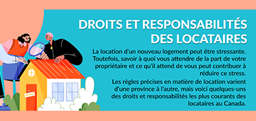 Louer un logement dans un nouveau pays peut être stressant. Notre infographie sur les droits et responsabilités des locataires a été créée pour aider les nouveaux arrivants à comprendre ce qu’ils peuvent attendre de leur bailleurpropriétaire et ce que celui-cileur propriétaire attend d’eux.Louer un logement dans un nouveau pays peut être stressant. Notre infographie sur les droits et responsabilités des locataires a été créée pour aider les nouveaux arrivants à comprendre ce qu’ils peuvent attendre de leur bailleur et ce que celui-ci attend d’eux. C’est un guide de base des règles les plus courantes pour la location au Canada, afin de rendre le processus plus facile pour vous et votre famille